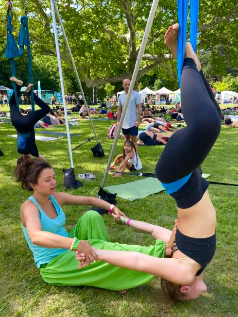 Aerial Yoga Klassen und Trainings in Wien, die du online buchen und mit deinen Freund:innen besuchen kannst. Es gibt alle Levels - von Anfänger bis zu Fortgeschritten.
