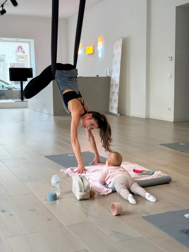 HdB Wien (Antigravity Fitness & Yoga)Diese Aerial Yoga Stunde ist für alle Mamas ab 8 Wochen nach einer natürlichen Geburt und ihre Babies im Krabbelalter geeignet :) Nach einem Kaiserschnitt frühestens ab 10 Wochen bzw. nach Rücksprache mit dem/r Gynäkologen/in. Aerial Yoga ist eine spezielle Yogapraxis, bei der die Übungen mithilfe eines hängenden Tuchs ausgeführt werden. Gemeinsam werden wir uns im Tuch entspannen, dehnen aber auch einige Übungen zur Kräftigung der Muskulatur ausführen. Dein Baby kann währenddessen auf der Matte spielen oder nach deinem Wunsch bei manchen Übungen auch mitmachen. Das Training ist sehr gut für Anfänger geeignet. Bitte nimm in das Training eine Krabbeldecke und das Lieblingsspielzeug deines Babys mit :) TARIFE: 1 Training 25 EUR 5er Block 90 EUR 10er Block 160 EUR Die Blockkarten können für alle unsere Trainings verwendet werden. Du kannst damit also auch die Aerial Yoga Trainings ohne Baby, Bungee Fitness, Bungee Dance und SuperJUMP besuchen :)